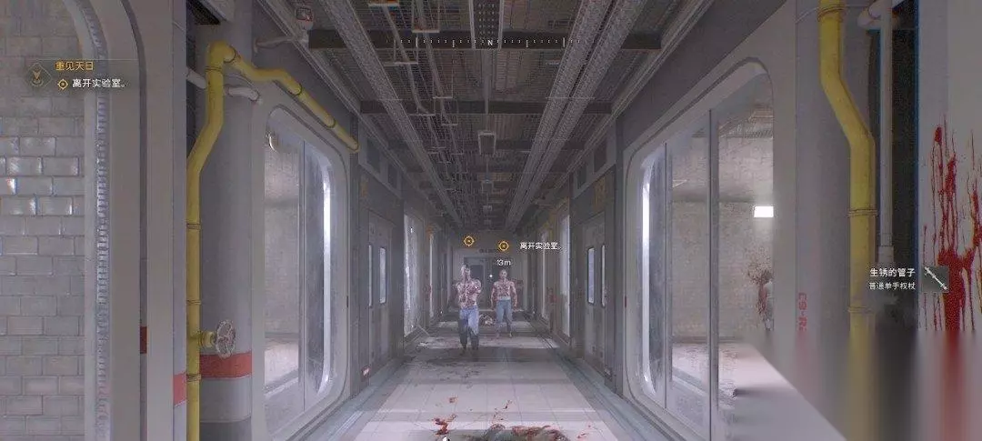 顺利潜行过来,我们要路过停尸房,这里全是丧尸,我们会拿旁边的水管当武器。现在可以长按鼠标左键打强力攻击。