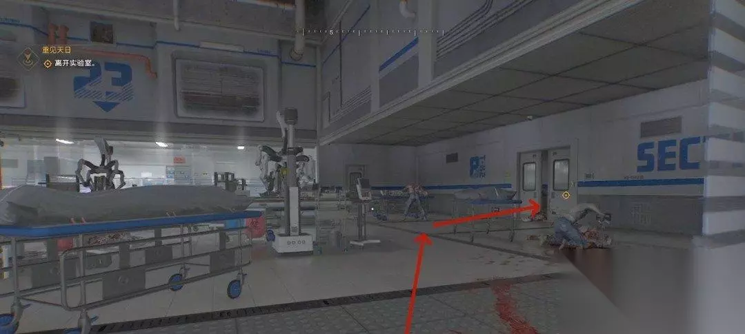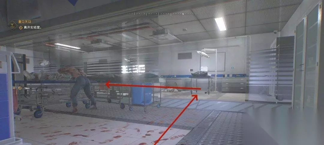 给自己扎一针后我们就可以行走了,旁边的桌子上能找到物资。