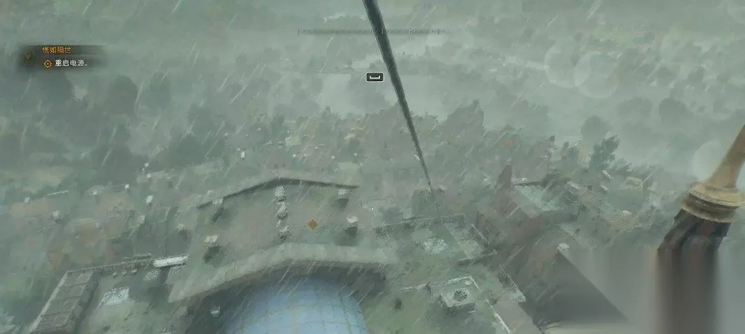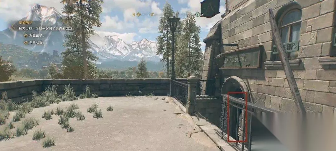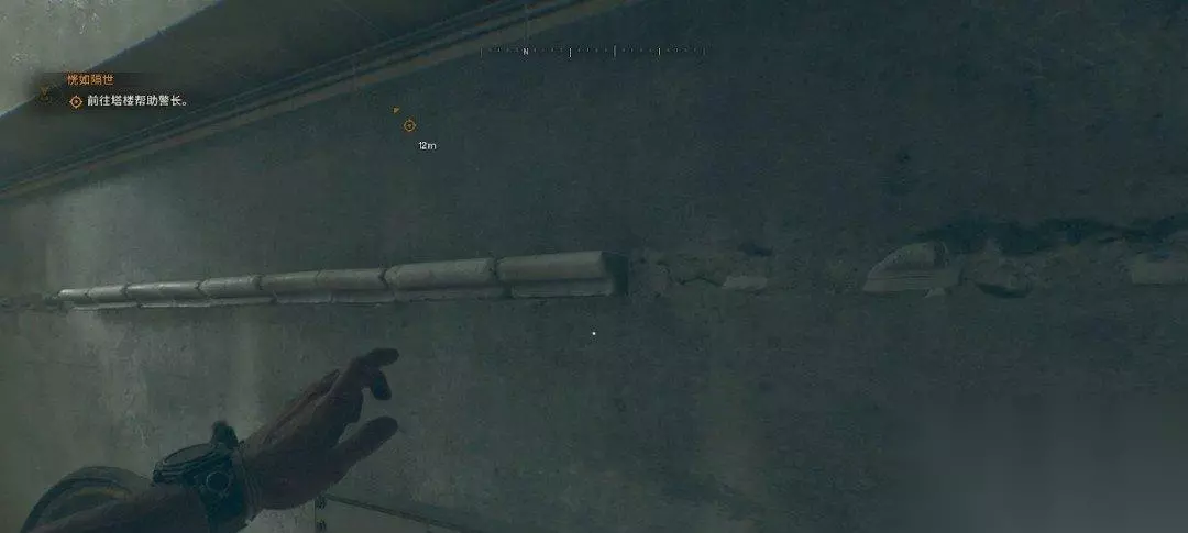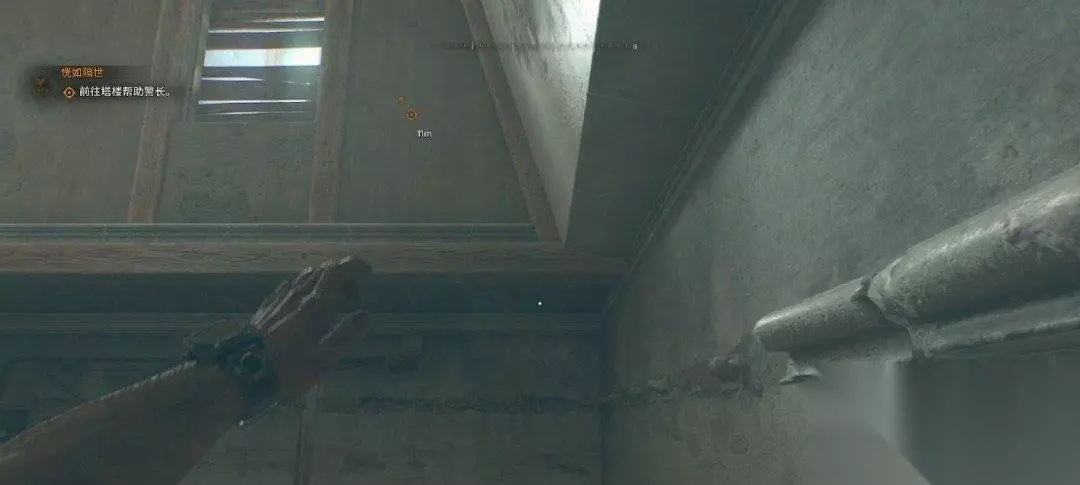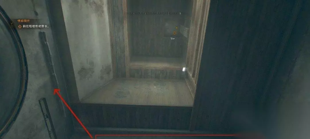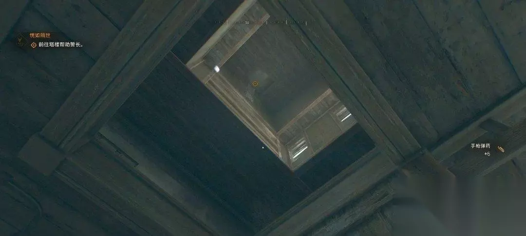 警长在塔楼上,我们在天井处往上看,沿着对面的建筑爬上去,直线爬即可。