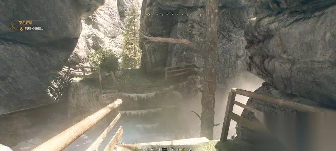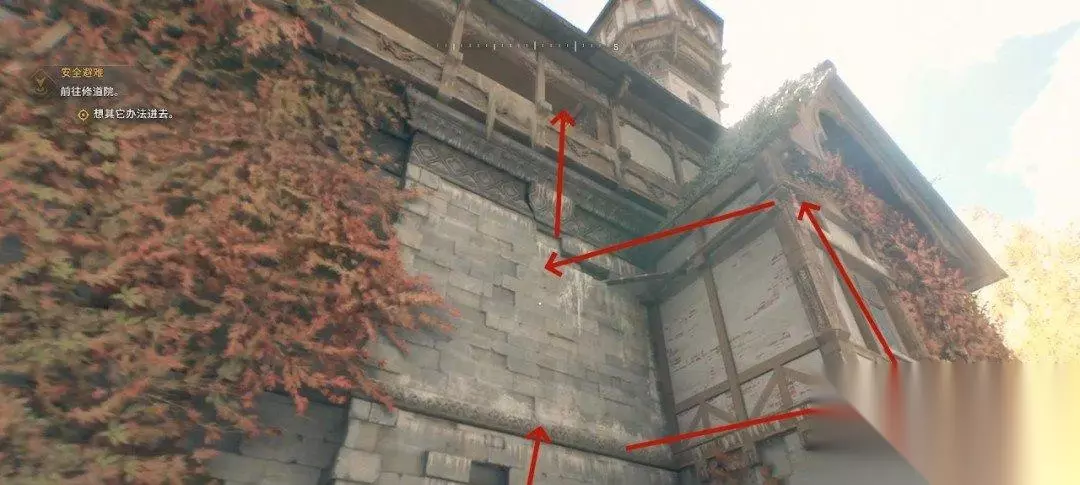 攀爬的时候会出现提示。在我们悬挂的时候可以通过鼠标移动视角方向转向,按下空格键跳跃到另一个边缘。