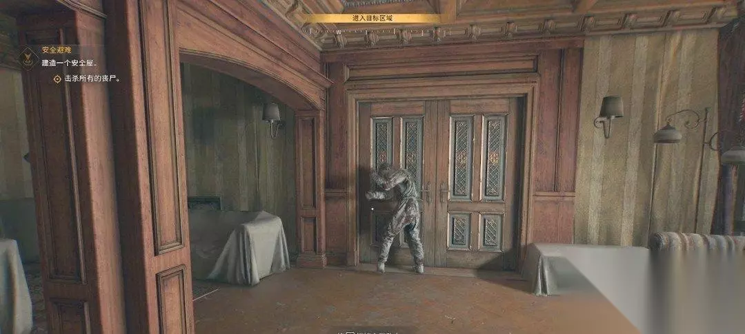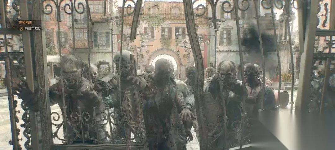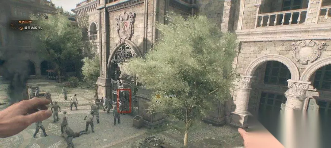 跟着目标点来到市政厅的外面,我们可以从这个门缝钻进去或者爬进去,不过门口有很多丧尸,可以在旁边跑一圈吸引开。