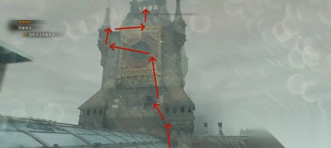 上来后我们可以直接踩着前面的钟表爬上红框处的白色石墙,接着跳到左边的白墙。