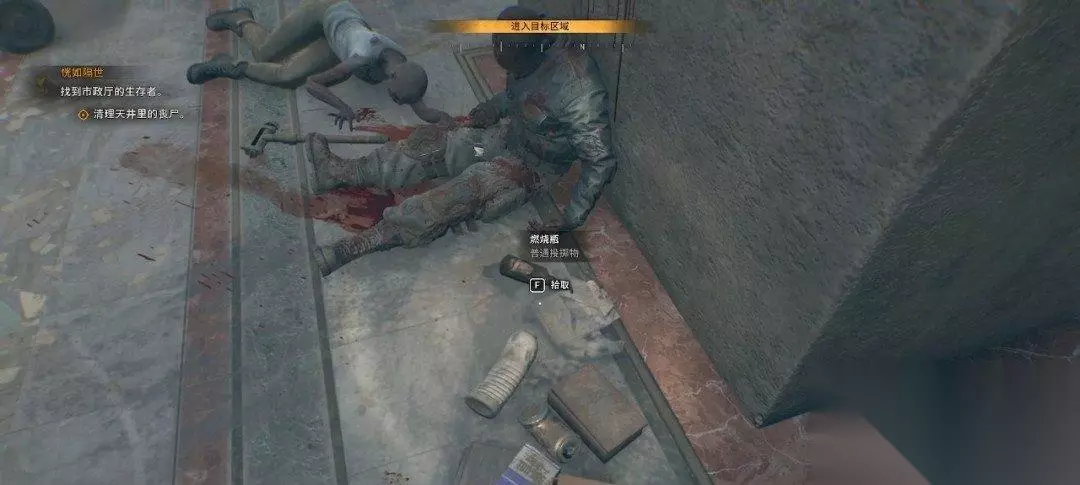 我们沿着目标点一直走,来到市政厅的天井处。这边有很多丧尸,我们可以拿地上的燃烧瓶或者瓦罐来解决掉它们。