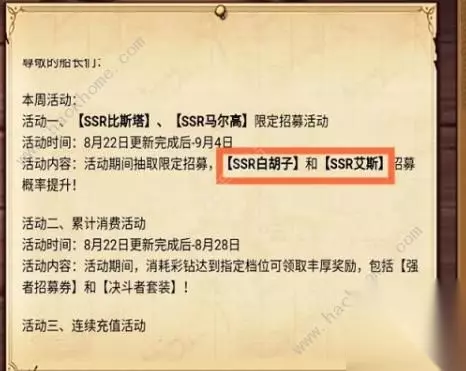 本次其实有五大活动,但三个都是与充钱有关的,所以这里直接整合起来了。 一个是连续充值,7天之后送7级速度宝石。本来这类活动是要送SR的,但大家知道的,为了赚钱这段时间的SR是一个没出。所以只能把7级速度宝石给抬出来了,可以视个人情况选择。 第二个就是累计消费活动,达到一定档次送强者招募券和决斗者套装。也都是知道的,门槛高,普通玩家消费不起,只能靠着一些高氪金玩家支撑着。 第三个就是限时礼包,关于经验与培养方面的,每次新出SSR都会卖一波这些培养礼包,但真正买的多人有多少就不得而知了。 4、公告又出错了