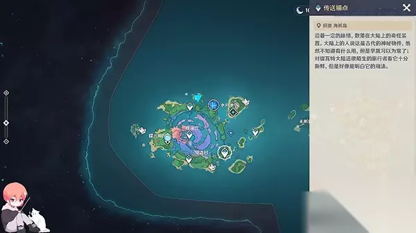 1、首先我们通过传送锚点来到海祇岛,也就是地图中下方的提示点;