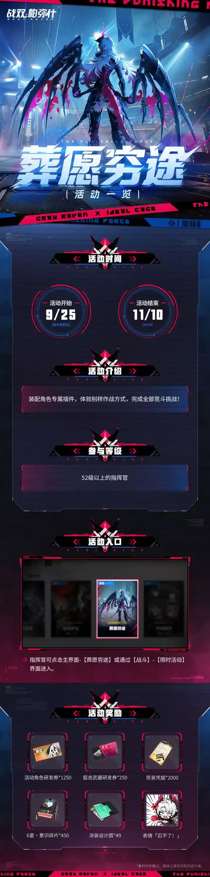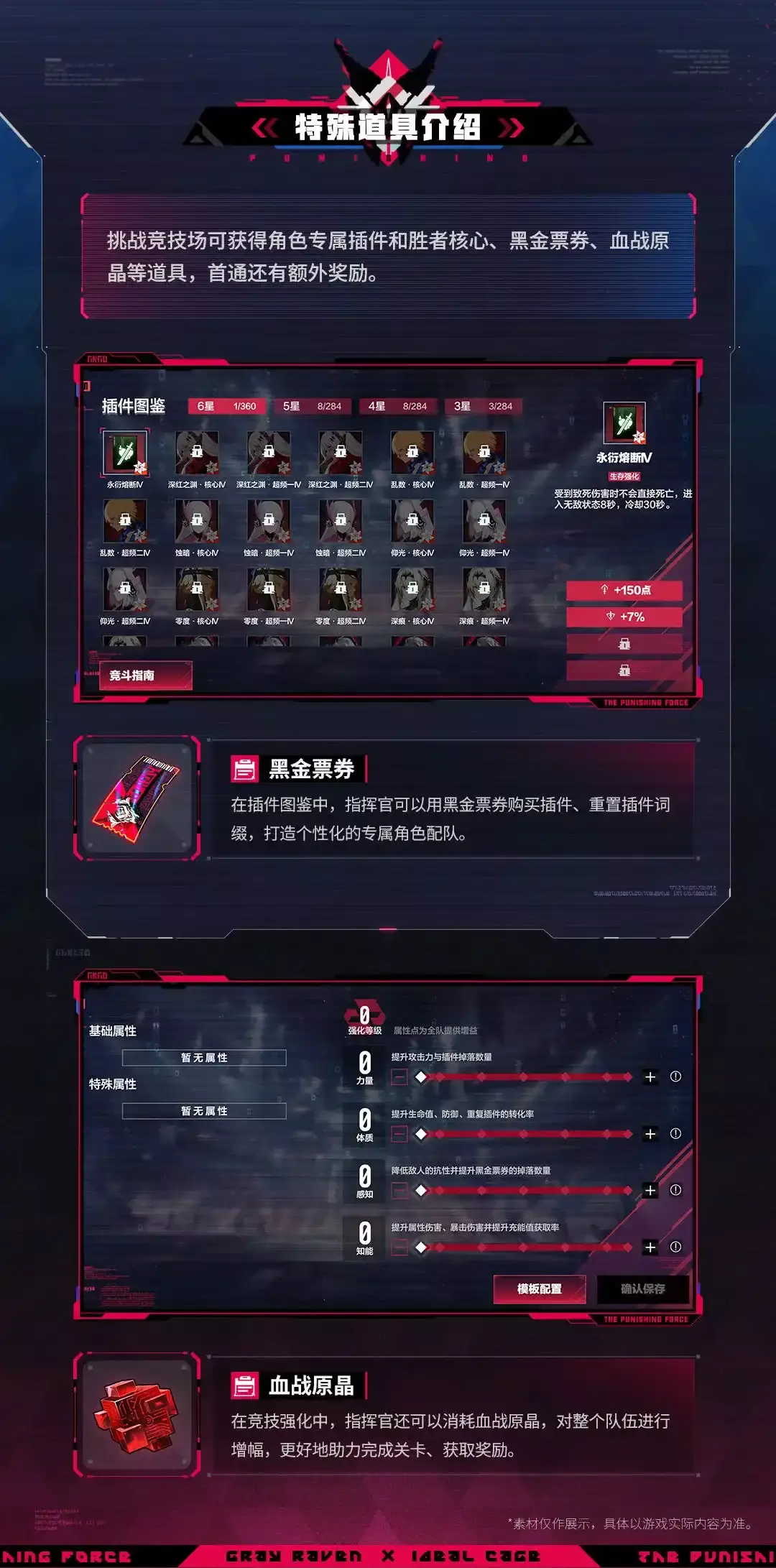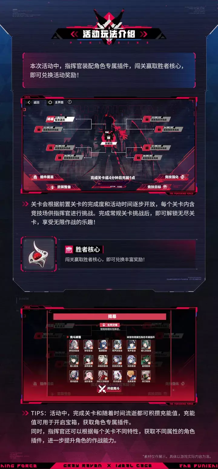 •活动包含9个章节,章节随时间与前置章节的通关状态开放,每个章节具有不同的竞斗环境,并掉落不同的角色插件。