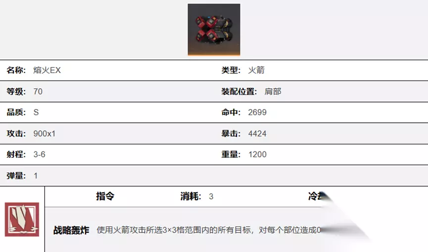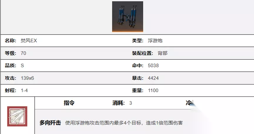 四、 数值解析 浮游炮具有最高的基础命中,基础暴击与其他武器持平,基础攻击139*6仅次于火箭900,但受攻击目标数不同的影响,很难比较实际伤害能力,仅能大致比较。 这里我们仅以单一攻击目标进行分析其伤害能力, 浮游炮单发834,算上洛莎审判的复数4发攻击,就是834*(1+0.4+0.4+0.4)=1834.8 导弹单反475*(1+0.5+0.5+0.5)=1187.5,算上双肩打击就是,475*0.75*2.5*2=1781.25 可以说,浮游炮基础单体攻击能力不强,只有在机师加持下,能够多发复数攻击时,单体伤害才会比较