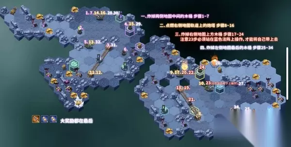 1.炸掉两侧地图中间的木桶 步骤1-7 2.点燃右侧地图轨道上的炮塔 步骤8-16 3.炸掉右侧地图上方木桶 步骤17-24(注意23步必须站在蓝色法阵上操作,才能将自己带上去)。 4.炸掉左侧地图最后的木桶 步骤25-34 以上是小编为各位带来剑与远征奇境探险凄寒高地路线怎么走的全部内容,更多精彩游戏资讯,请持续关注233乐园。