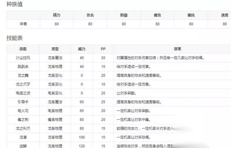 种族值、技能表: