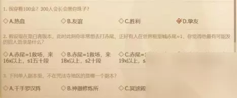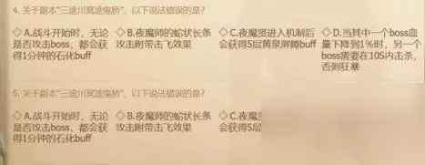 13、“赤尾”是哪个副本里的boss?:绿明湖仓库。 14、下列单人副本里,不在咒法寺地区的是哪一个副本?:无尽之塔。 15、主线剧情中,主角在黑龙教藏身处救出了谁?:柳儿。 16、以下哪个是灵石草原黑罚头的名头?:浑天教风之草原分舵主。 17、关于副本“0号机库”最终boss雪影0式,以下说法正确的是?:即便没有全部消除雪影0式身上的保护层buff,它也不会狂暴。