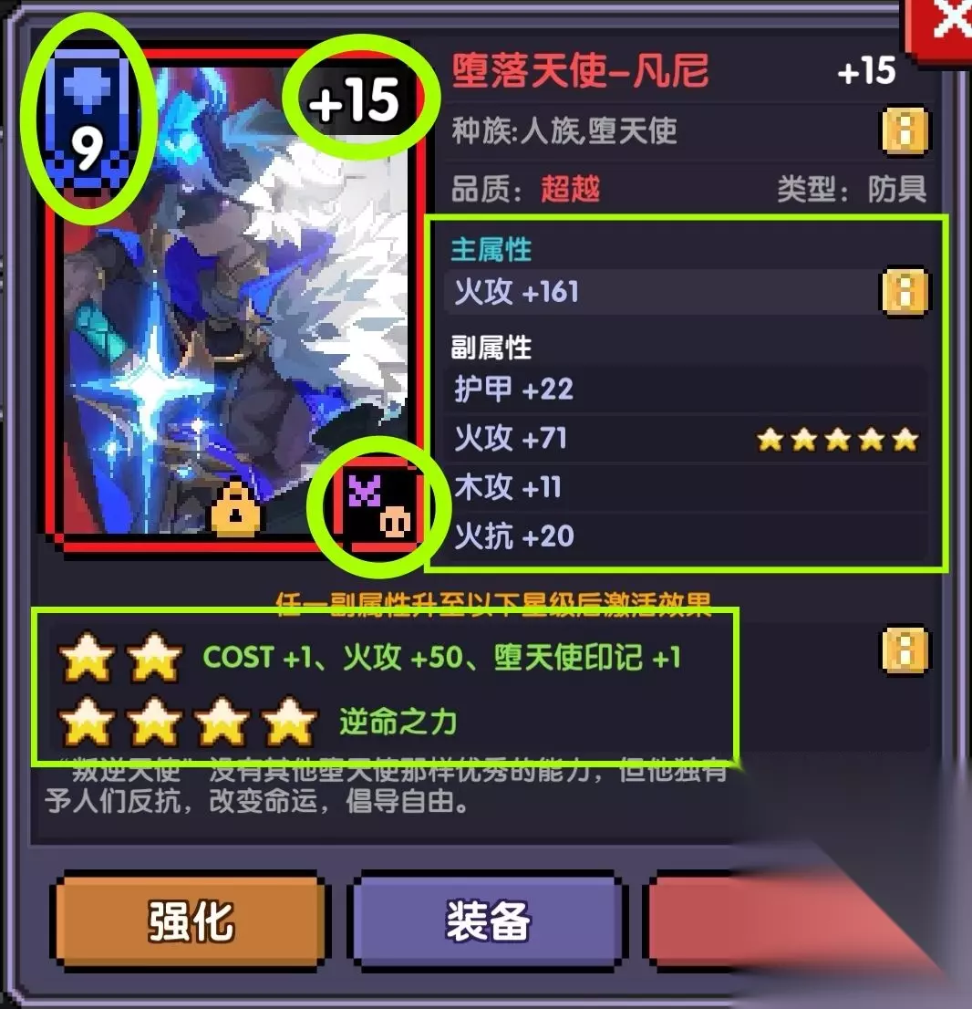 左上角为消耗cost值与该卡的部位(红框武器卡、蓝框防具卡、绿框饰品卡,该卡为防具卡); 右上角为魂卡等级,右下角为魂卡种族; 右侧方框为主属性、副属性; 下方方框为星级效果。 3、魂卡推荐