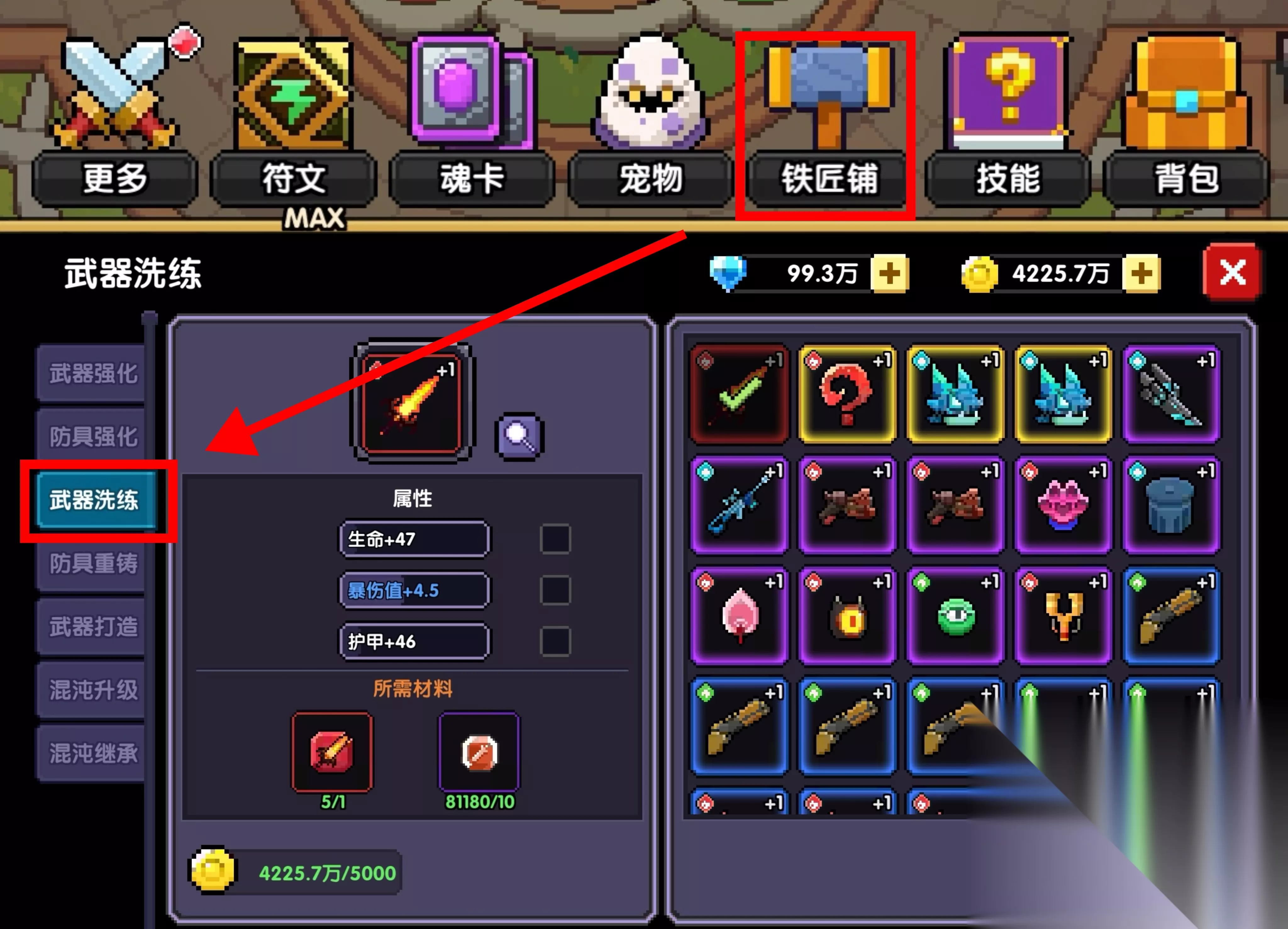 通过上面的方法,我们至少可以获得两把炎息,那么就可以分解其中一把获得碎片,在铁匠铺的武器洗练处洗练属性了。 洗练的属性推荐护甲穿透、首领伤害。由于是过渡武器,因此也不必精益求精,稍微洗两下子即可,多余的碎片也可用于后续的炎息魂珠升星。 4、武器强化