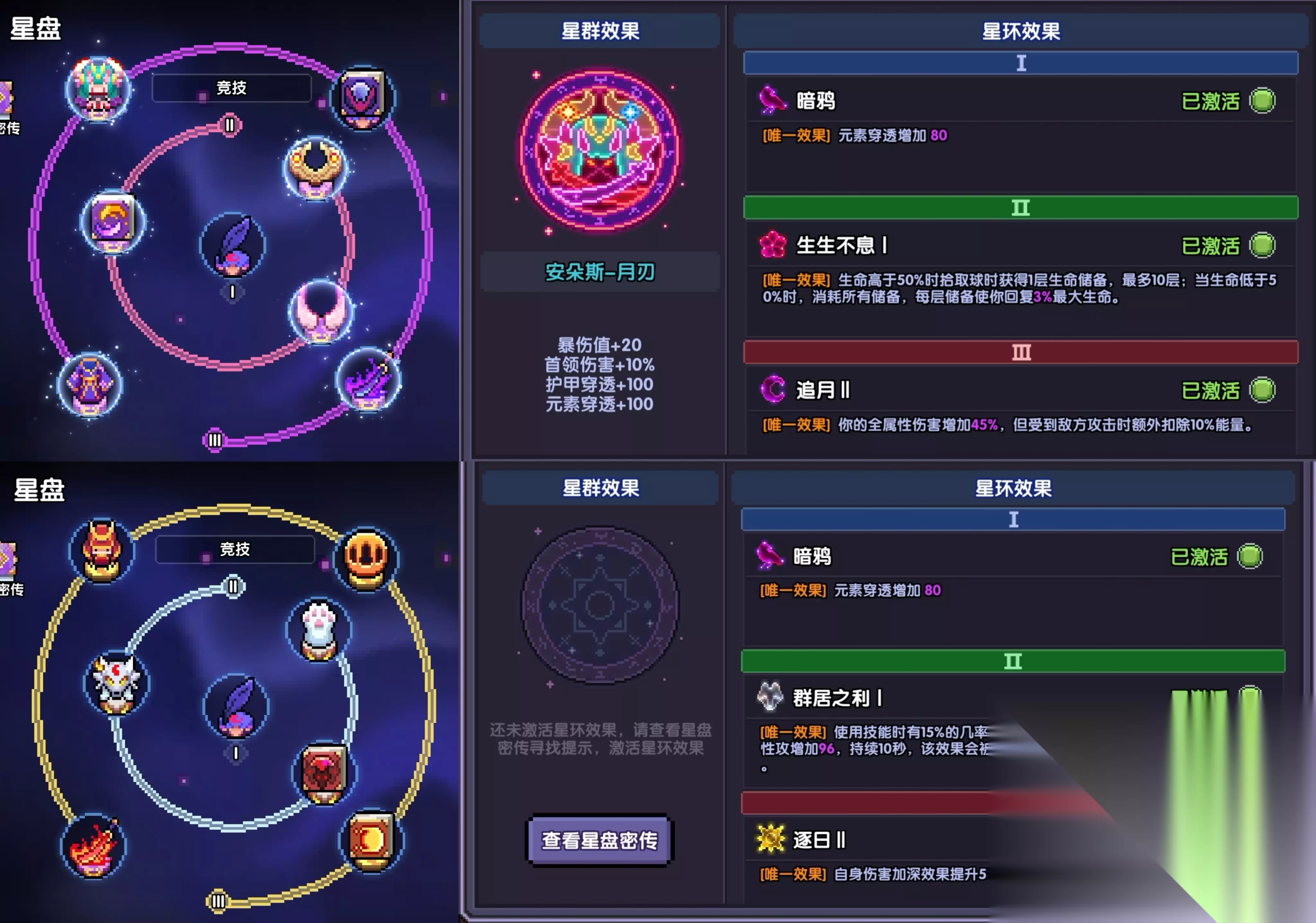 这边推荐两种方案: 上方的3月2花1乌鸦的安朵斯月刃星盘,是通用且好用的星盘,直接无脑带即可; 下方的3日2狼1乌鸦散搭星盘,可以在带月刃蓝量总是不够时作为替代使用。 【小秘境推关技巧】 1、找到关卡祭坛房