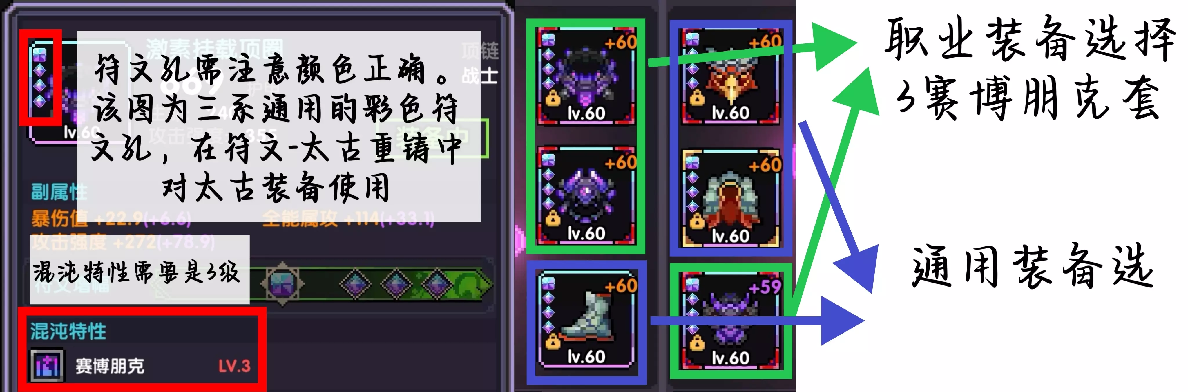 小秘境120层前,挑选防具主要注重符文孔颜色即可; 通关小秘境120层,解锁混沌地牢后,就可以去刷取如今强力、主流的混沌装备了。 首要目标就按上图来,刷取符文孔颜色正确(新流派低语对应蓝色)、混沌特性3级、3件赛博+3件刺壳套。 需要注意的是,赛博套想要吃满效果有两个特殊的要求:一个是天赋需携带强心;另一个是技能需携带一个回复技能。 【符文】