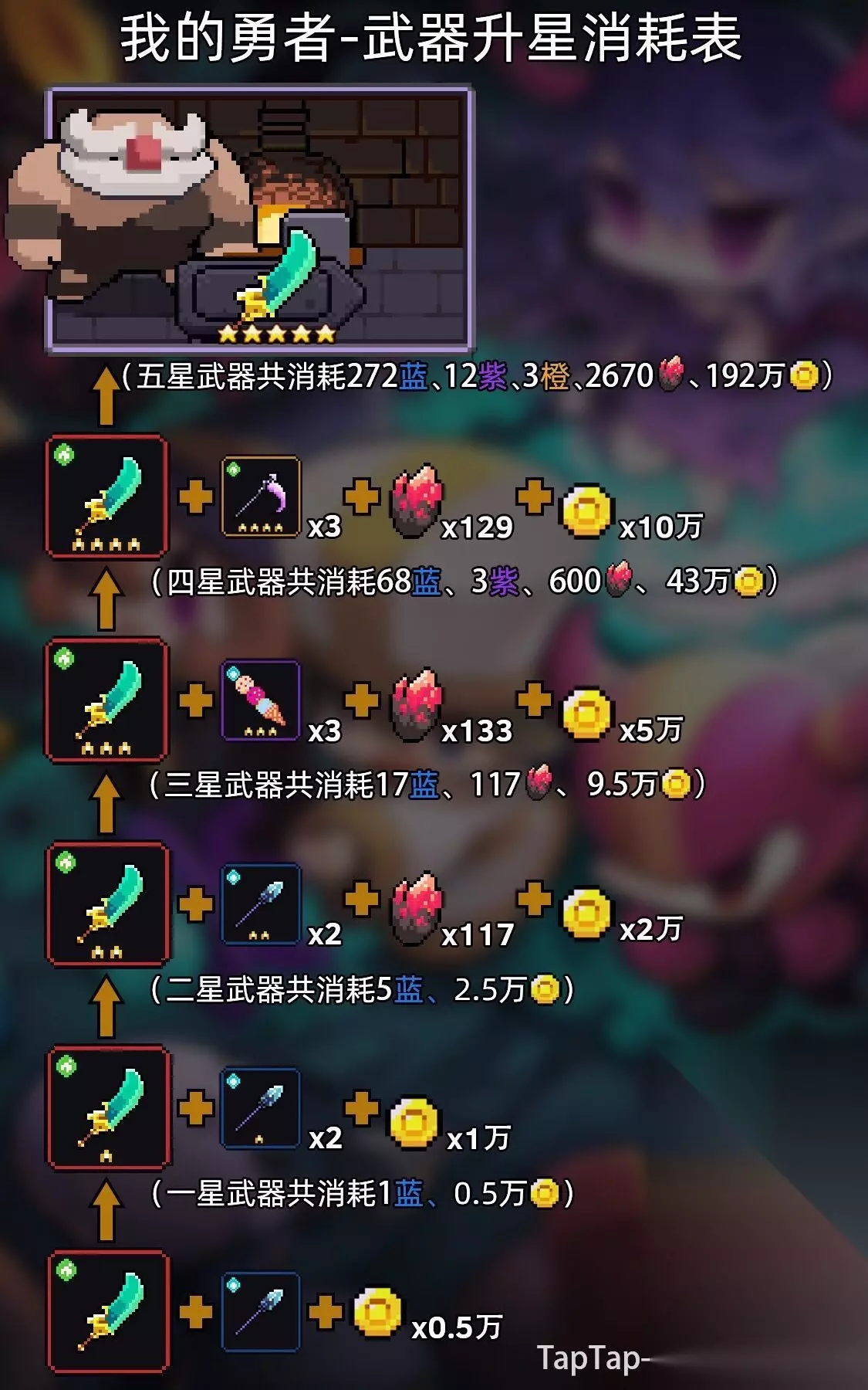武器的强化分为升级和升星。 升级需要消耗血源矿、武器,由于前期缺武器一般只用血源矿升级。前期的一些关卡奖励、任务奖励都会送血源矿,一般不会太缺。 升星需要消耗同星级武器,0星到3星需要17把0星的武器(俗称狗粮)。切记炎息最多只升到4星,后续可作为新魔女武器低语的升星材料。 具体消耗可参考下表↓