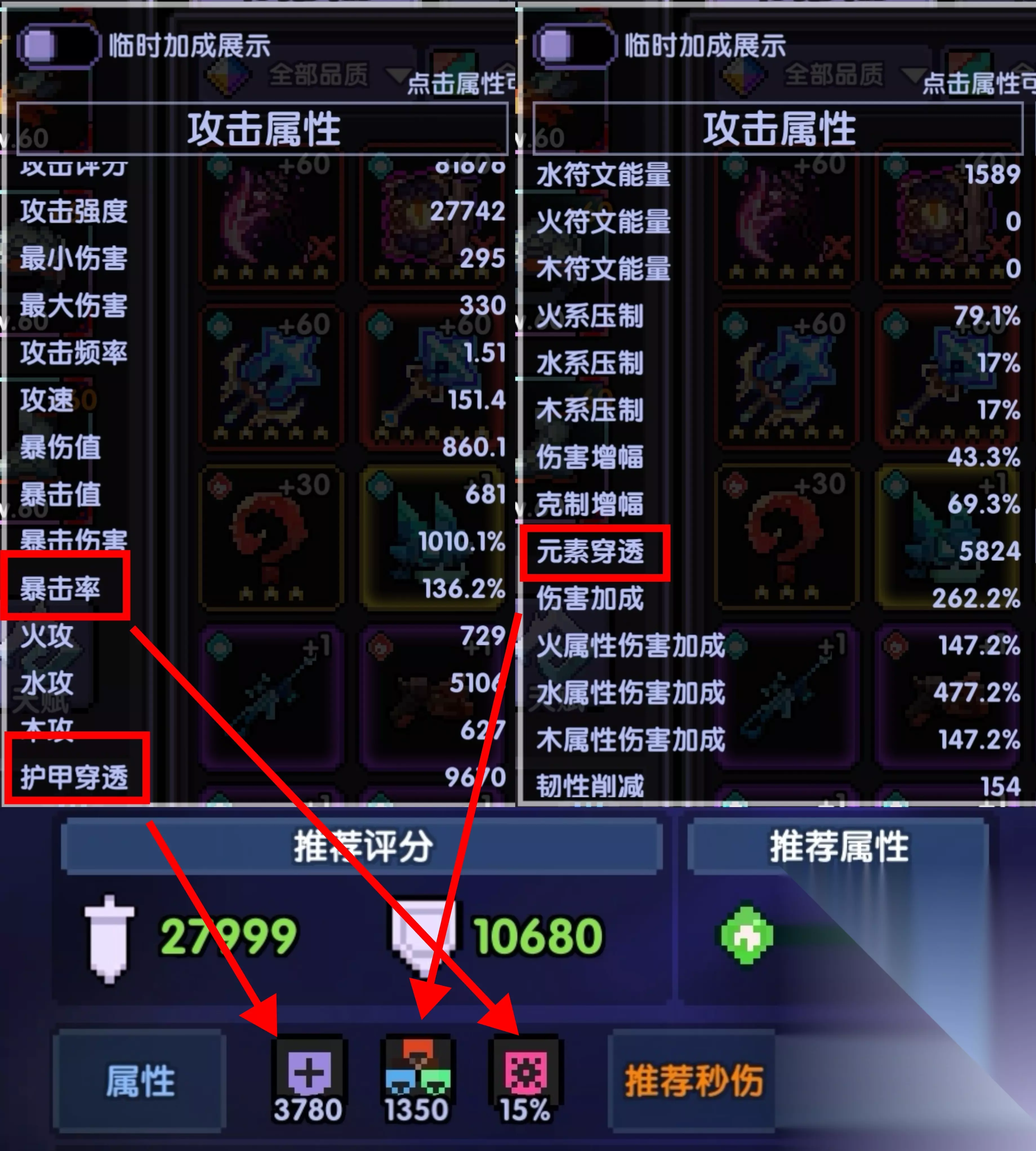 触碰获得祭坛效果后可大大降低通关难度,尤其是低层的小秘境可以靠祭坛打出很多的伤害。 需注意有时候祭坛房会被技能房替代,只需要重开刷祭坛房就可以了。 2、副手武器 前期不氪金短时间获得推荐的副手限定武器(王琪和闪光冲浪王)的难度还是比较大的,副手武器就可以随便带两把橙武,并且对他们进行升级、升星、洗练。 洗练时可查看可能出现的属性,优先选择护甲穿透、暴击值、首领伤害。 3、属性自查