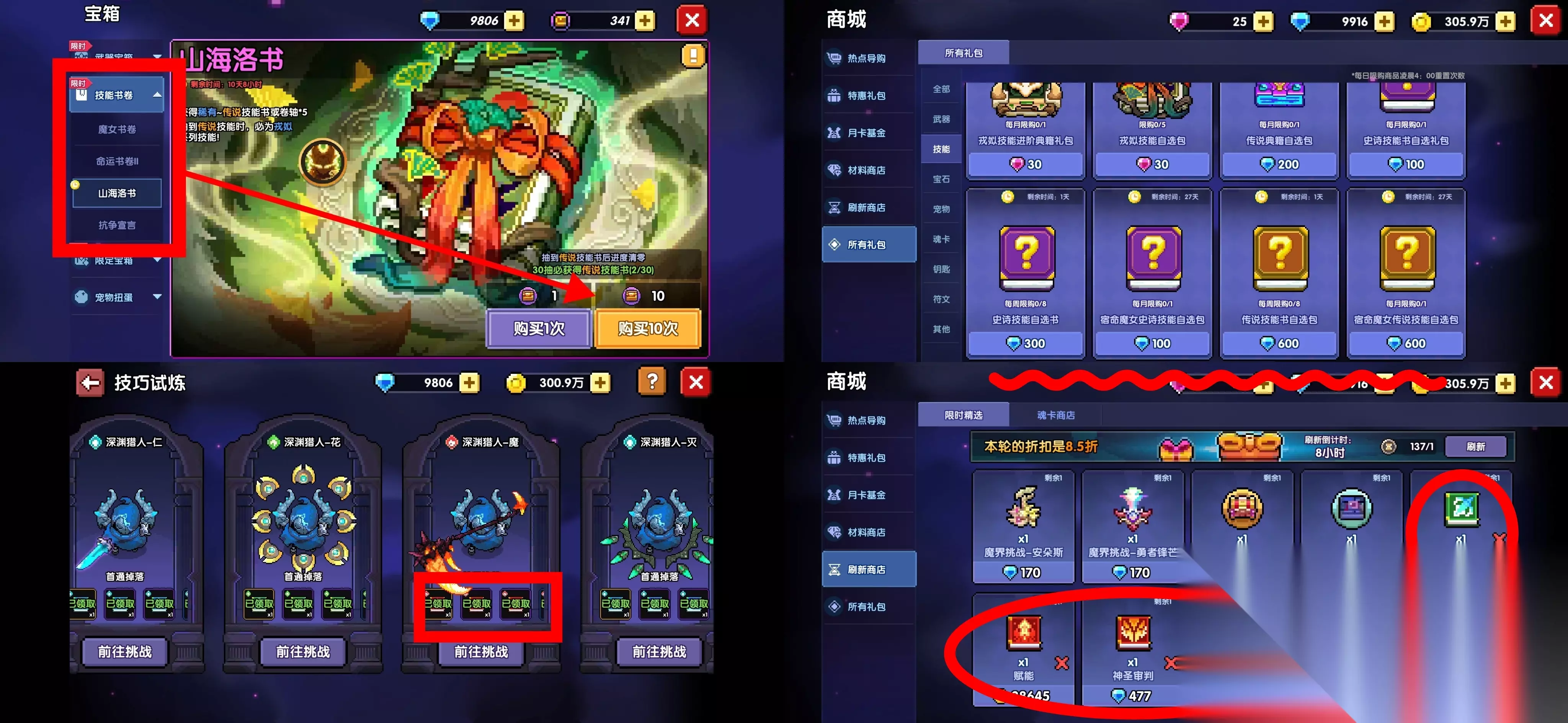 技能获取主要有4个方式,宝箱抽取、商城购买、日常玩法的技巧试炼获取、商城中刷新商店。 其中,新流派低语配套的技能可以在宝箱中技能新池子高概率获取;刷新商店中除了最新的啥都能刷到,但是需要较多的刷新币反复刷新。 【防具】