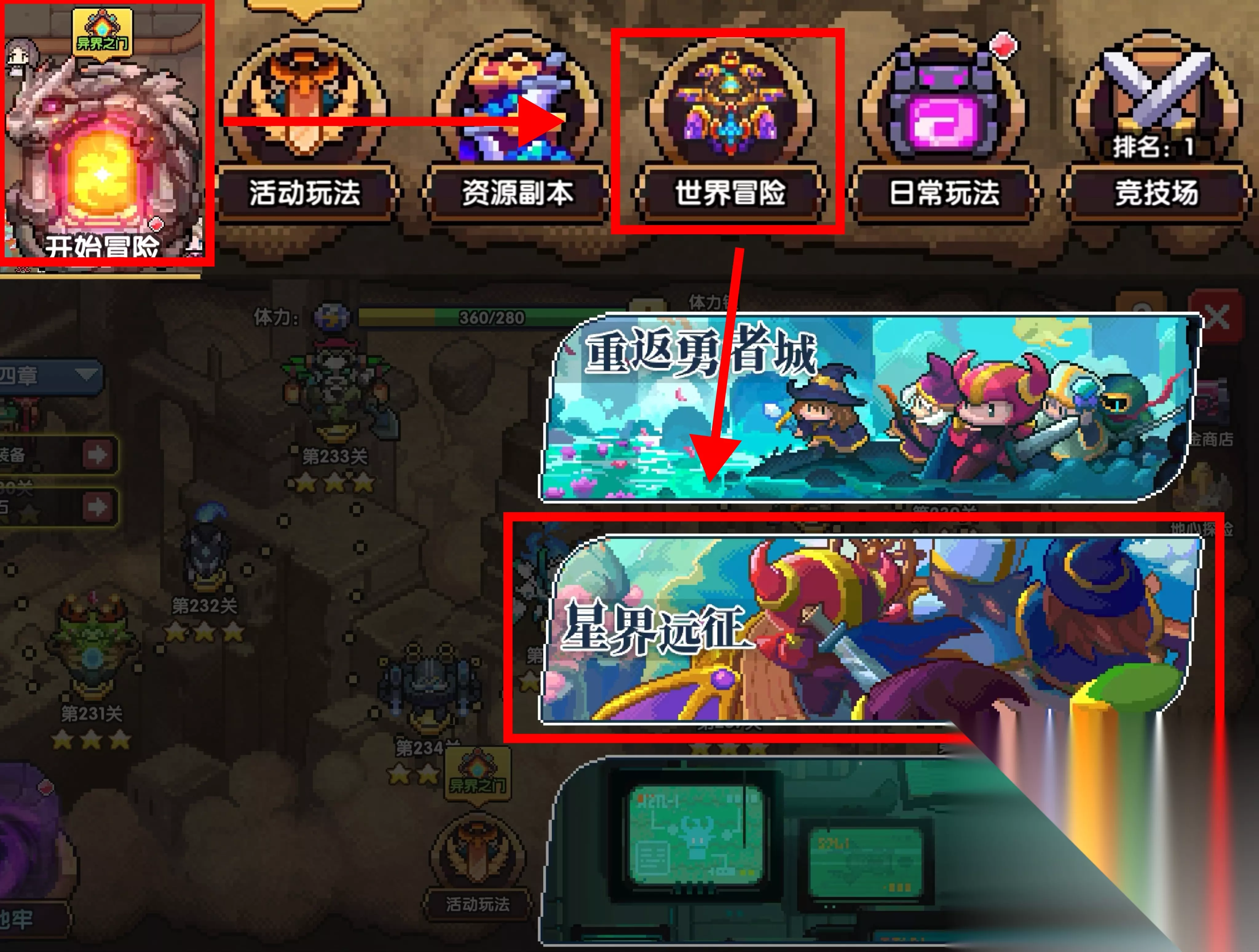 主要在混沌地牢(刷取混沌暗金)和资源副本消耗体力。 首先,推荐每天把五个资源副本都扫荡一遍,每天第一次有三倍掉落加成,如果开了勇者契约就扫两遍。第一个血源矿树除非极度缺矿否则一般不打。 其余体力,根据自身情况进行选择: ①若身上混沌装备未凑齐混沌特性3级的3件赛博朋克套和3件刺壳套,则优先刷地牢。刷出上述装备伤害可以大大提升; ②若身上装备已齐,则优先扫荡宝石遗迹,刷取宝石材料,培养过渡宝石和聚合区的宝石。 除此之外,还需要兑换星界远征门票,只推荐在周末打困难的。可以在每周使用电池后兑换。 【钻石分配推荐】