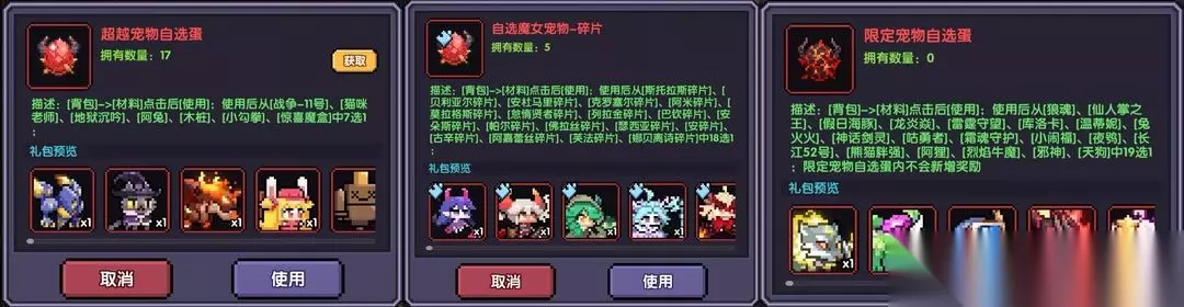 低品质的宠物一般只用于开羁绊,主要的养成内容、使用宠物,都是红宠(超越宠物)。 宠物的获取由易到难可分为三类,普通红宠、魔女宠、限定宠。(上图从左到右) 魔女宠可通过商店购买宠物蛋、各种玩法获得魔女宠物碎片合成、宠物商城换取扭蛋币抽取等方式获取;限定宠物则多数只能在商店购买。 3、宠物推荐 ①平民通用