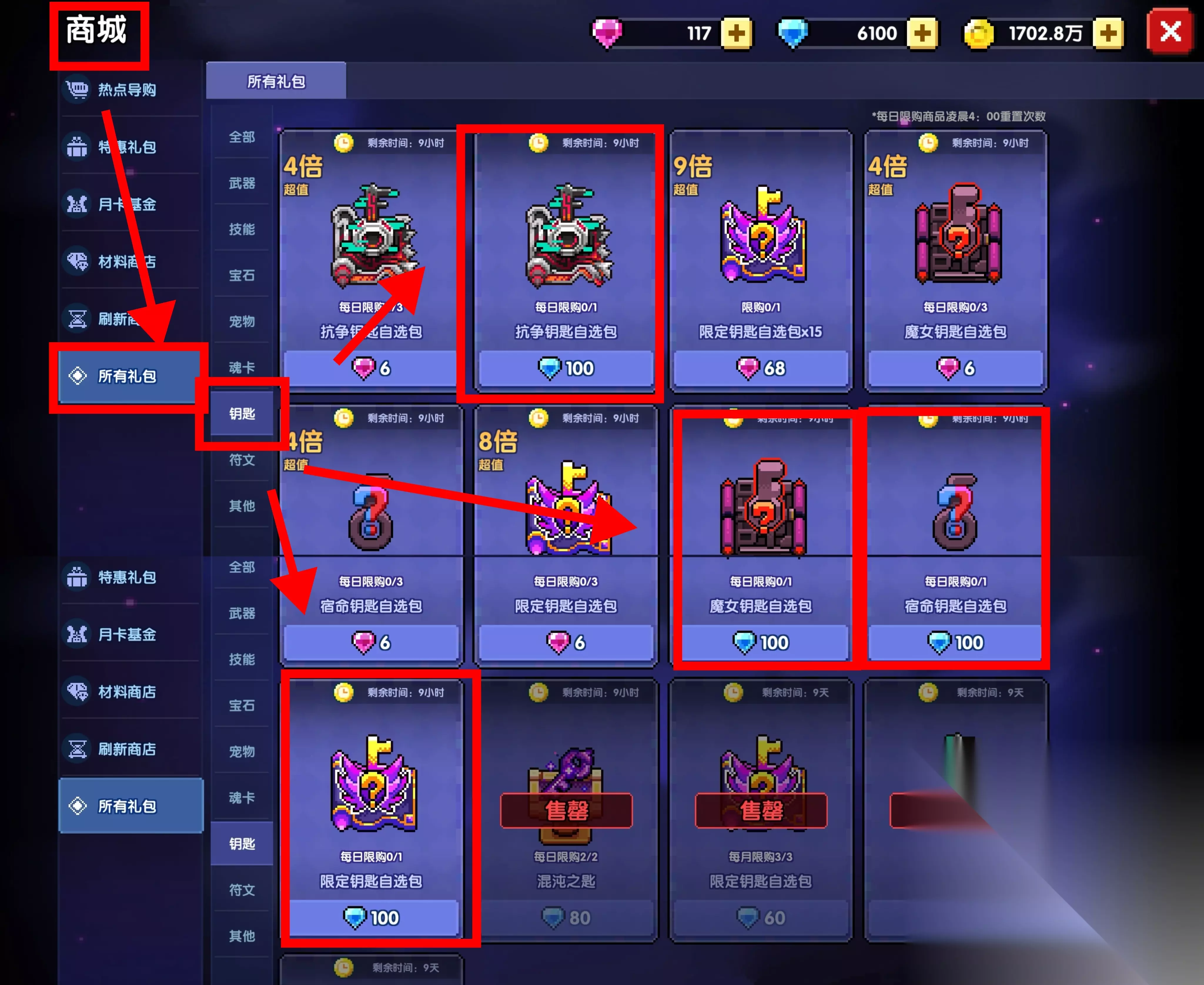 宝箱抽取限定武器只有在刚出的时候能用黄金币抽,其余时间只能用珍藏武器币抽,而珍藏武器币获取较为困难,想要大量获取只能靠钻石、氪金买,因此一般不考虑用抽的。 主要获取方式推荐在商店中每天购买上图的限定钥匙自选包,通过打钥匙获取碎片的途径打造限定武器。 4、限定武器觉醒