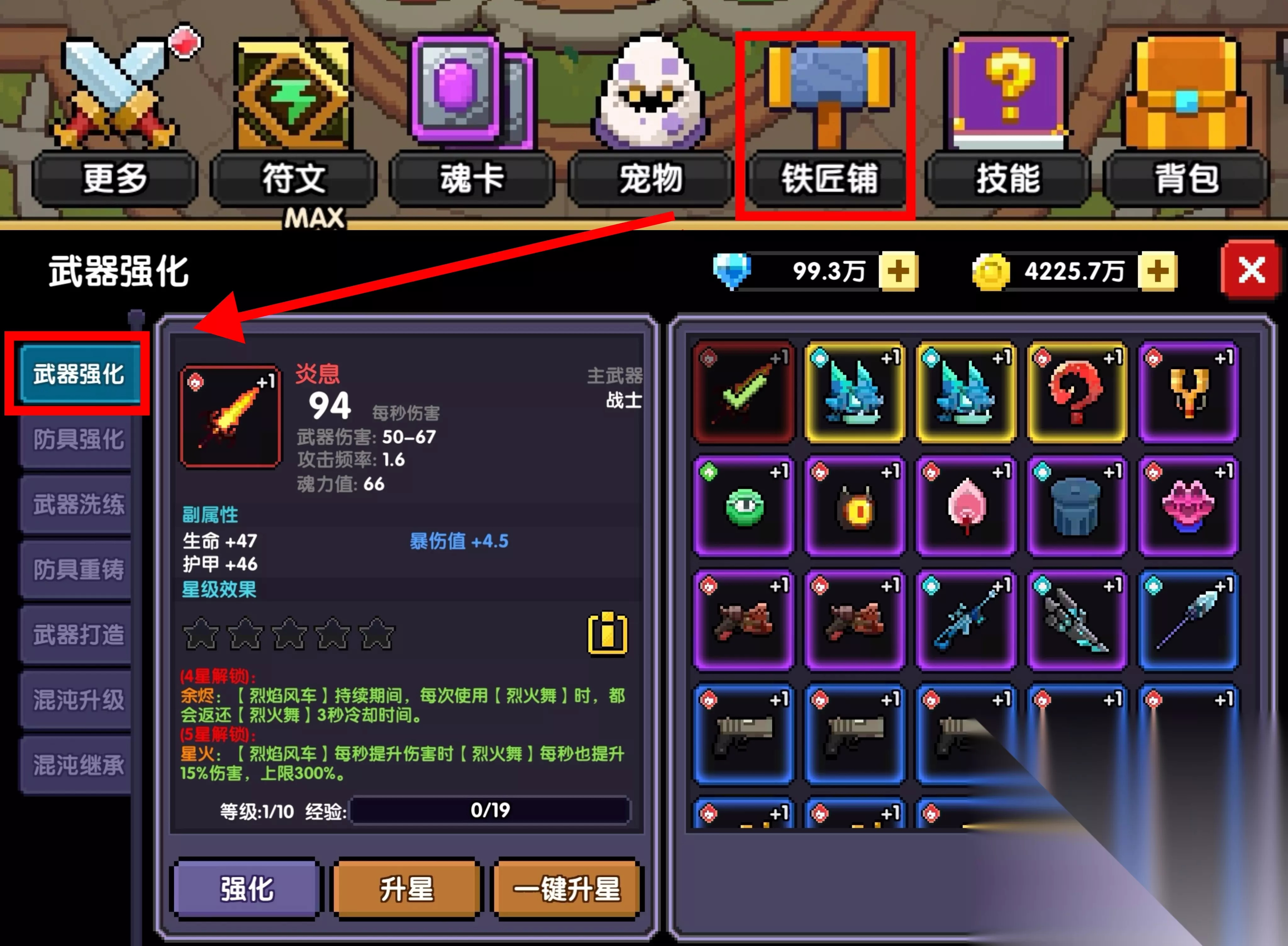 获取新武器低语后,首要目标就是将配套的对群、对王两个魂珠升到3星,并镶嵌于特殊槽,分别用于对群、对单场景。 ②其余普通魂珠