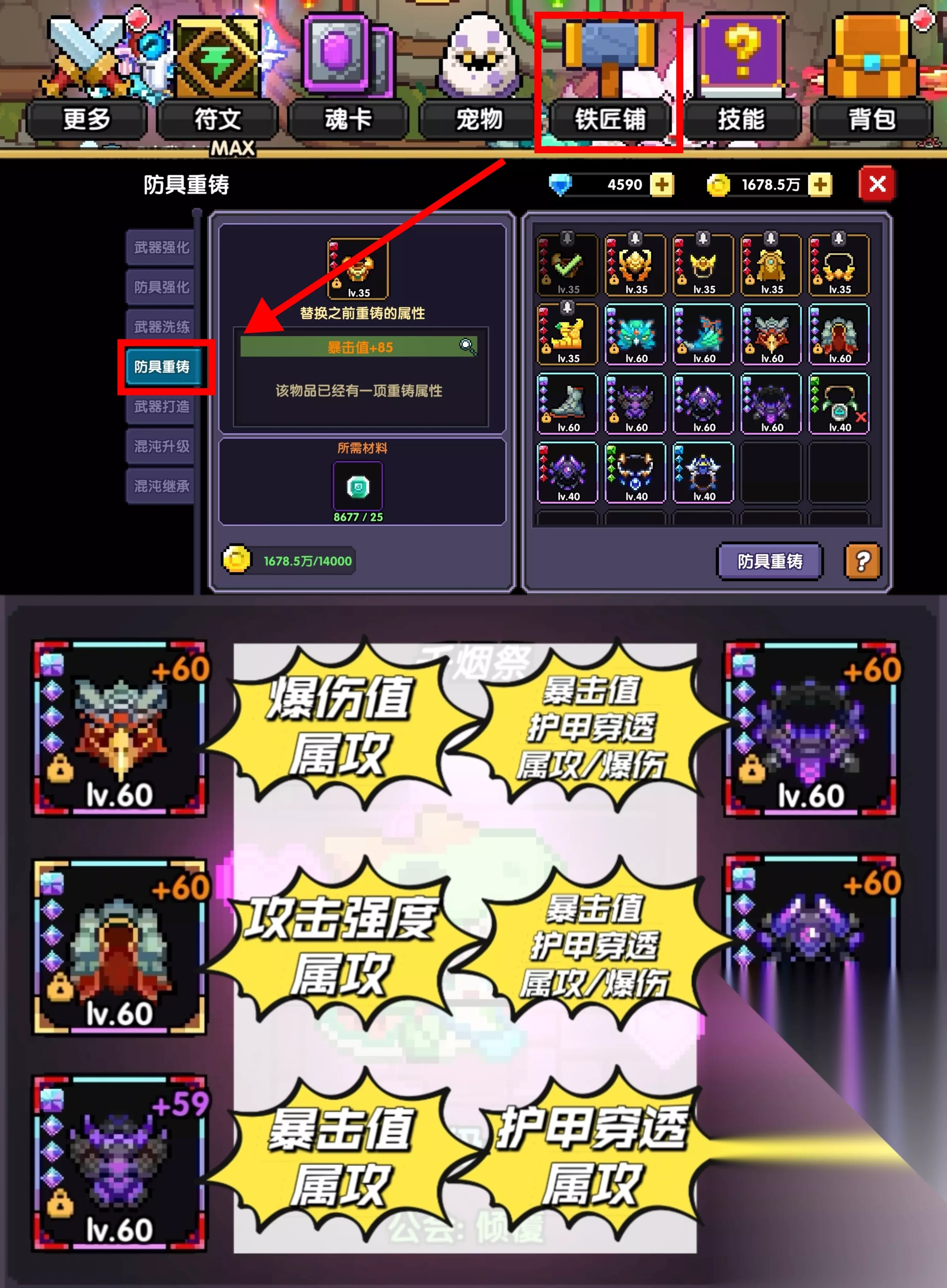 小秘境120层前的防具选择,首要看重符文孔,且优先保证大符文孔。 百层前玩炎息时,属性为火系,符文孔就要红色的;百层后换低语后,属性为水系,符文孔就要蓝色的。 3、防具重铸、属性挑选