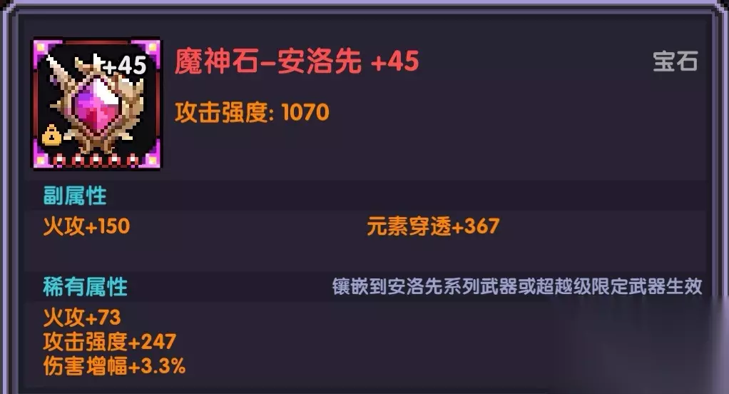 无需挑选副属性,需稀有属性为伤害增幅、克制增幅、三系压制之一。 其中,火系一般打木怪就需选择木系压制,其余两系以此类推。 ③竞技场、打桩专用宝石