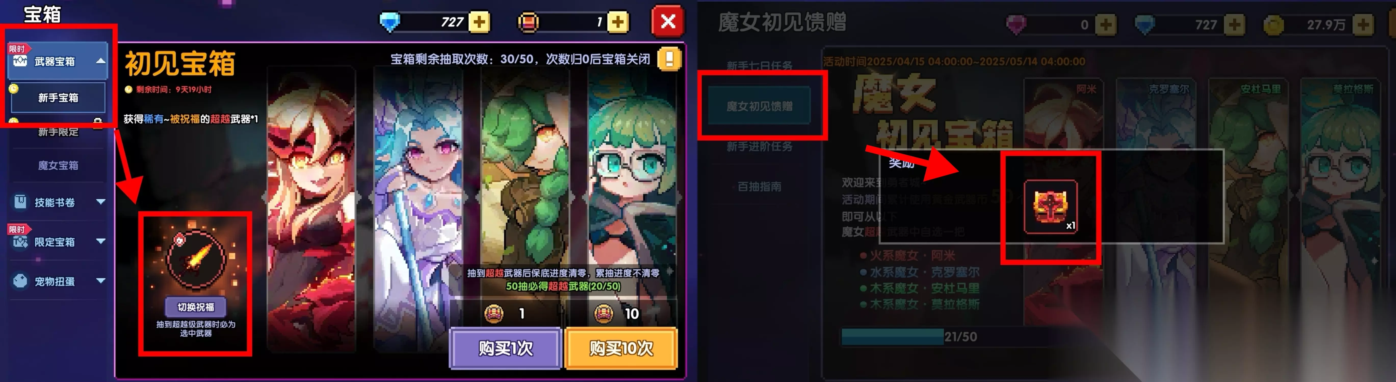 前期用任意武器推关,攒够黄金币后(靠任务获取,不需要用钻石),我们就可以去获取老魔女阿米对应的武器炎息进行过渡。 可以在宝箱中的新手宝箱中抽取、累计50抽后在新手100抽中魔女初见馈赠领取自选箱换取。 3、武器洗练