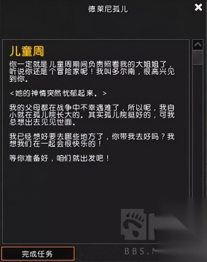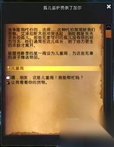 开始你的儿童周活动 当前版本的儿童周有两条任务线,分别是从经典旧世界双方主城孤儿院出发的任务线和从沙塔斯孤儿院出发的任务线。 联盟方任务线需要前往暴风城教堂广场孤儿院寻找孤儿守护者夜莺
