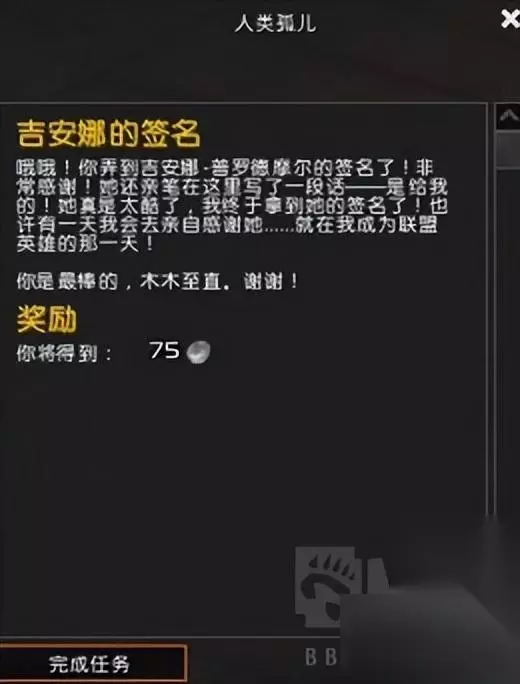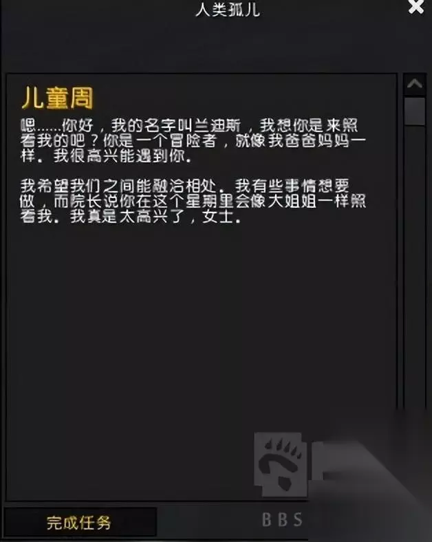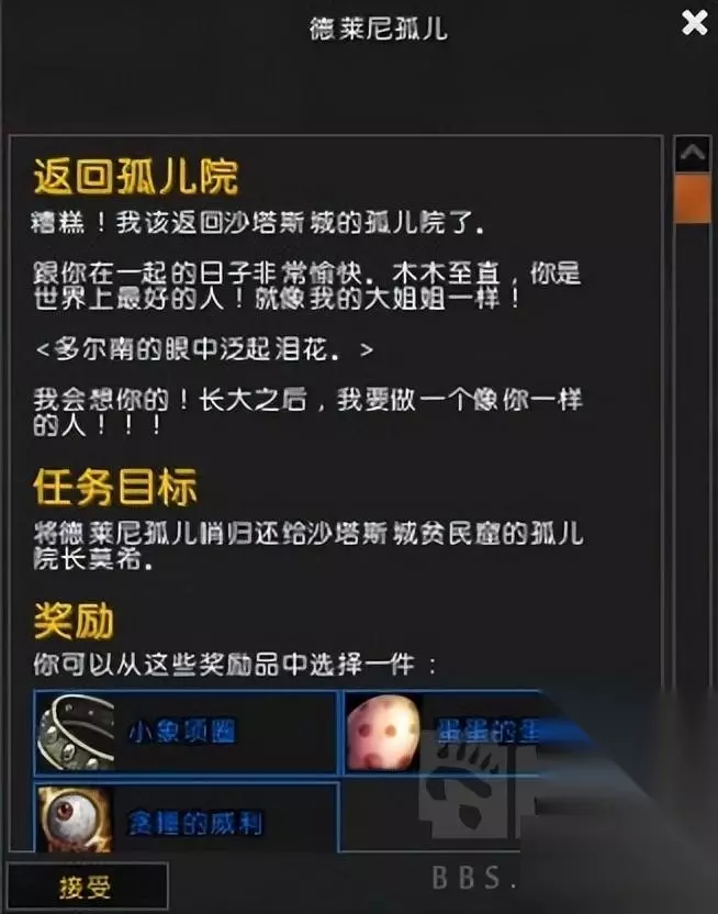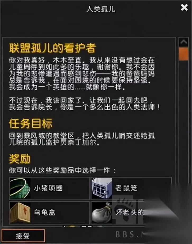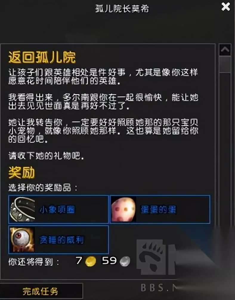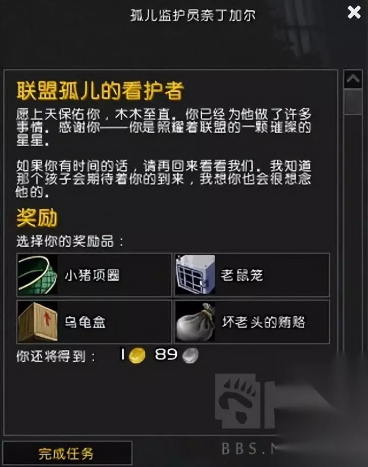 完成这一系列任务后,你可以回到孤儿守护者那里领取任务奖励,但同时你也会将哨子还给孤儿守护者。