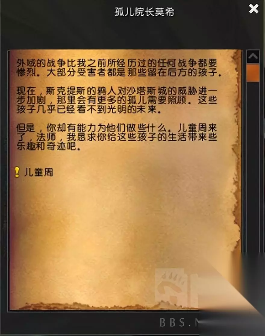 也许.你是不是也想照顾一下这个效仿你的样子的稚嫩可爱的小家伙呢?绝对可以,但请记住在儿童周结束之前回来回报哨子并领取奖励! 同时注意,四个奖励中,第四个选项只有5个金币。 外域沙塔斯任务线 我们回到了沙塔斯的孤儿院。