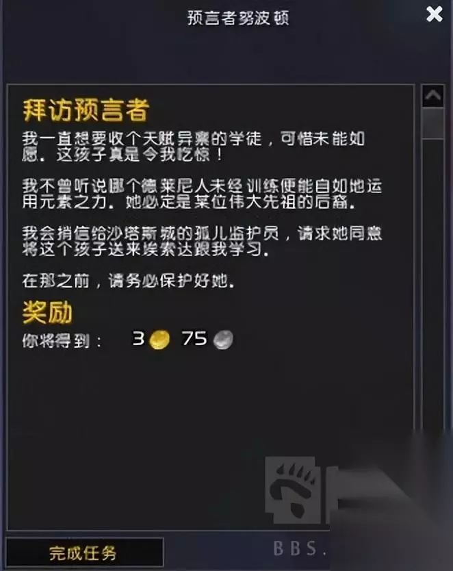 纳鲁告诉我们,这位小朋友的未来是无限的……让我们带领多南去找先知努波顿。多南发现努波顿就是梦中出现的萨满,并且对元素表现出了惊人的亲和力。 努波顿再次约了我们,我们会请多南来和他一起学习。