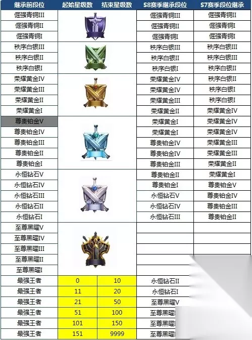 新赛季段位掉段规则 段位掉段调整内容: 1、钻石以上增加新段位—至尊黑曜 2、青铜白银不掉段,黄金铂金段位将略微掉段 3、高端段位:钻石以上段位保持原有的掉段幅度,尽量小的影响到大家的升段速度。同时,铂金阶段每个小段位5颗星将会降至4颗,白银每个小段位4颗星将会降低至3颗,铂金的5个小段位划分也将降至4个小段位 4、新增段位继承:整个赛季无排位,直接下降为青铜三,S8赛季根据上一次排位段位进行跨赛季的段位继承 小编点评:最强王者则下赛季从钻石开始,这样不用担心继续白金坑,钻石小幅度下跌,钻三以上下赛季依旧在钻石段位。 欢迎玩家们收藏关注233乐园王者荣耀官网专区,为玩家提供最新王者荣耀英雄出装推荐、新英雄上线时间表、体验服英雄视频和王者荣耀S7英雄排行推荐。每周手游排行推荐好玩的安卓手机网游,尽在233乐园。 编辑推荐: 你想知道的赛季皮肤爆料都在这:/钟无艳夏日皮肤大全 S8赛季重做英雄爆料都在这: 如转载涉及版权等问题,请作者与我司联系,我司将在第一时间删除或支付稿酬。 【小编推荐】专区入口 || 视频站入口 || 体验服申请入口 || 全民竞猜赢好礼 【新英雄爆料】| 司马懿 || 瑶 || 孙策 || 新英雄:囚徒/书圣/瞬 | 【新皮肤爆料】| 李白团战皮肤:敏锐之力new || 诸葛亮团战皮肤:掌控 || 典韦穷奇皮肤 Hot!! | 王者荣耀最新攻略 赛季段位继承表 每日一题 边境突围玩法攻略 体验服爆料
