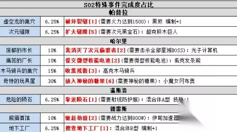 举个例子:表里有废都的市长事件,说明这个事件是会影响到S02进度100%的特殊事件。后边标记的我消灭了次元偷渡者[2],说明需要在2次时空域的周期里,成功的完成2次我消灭了次元偷渡者 。
