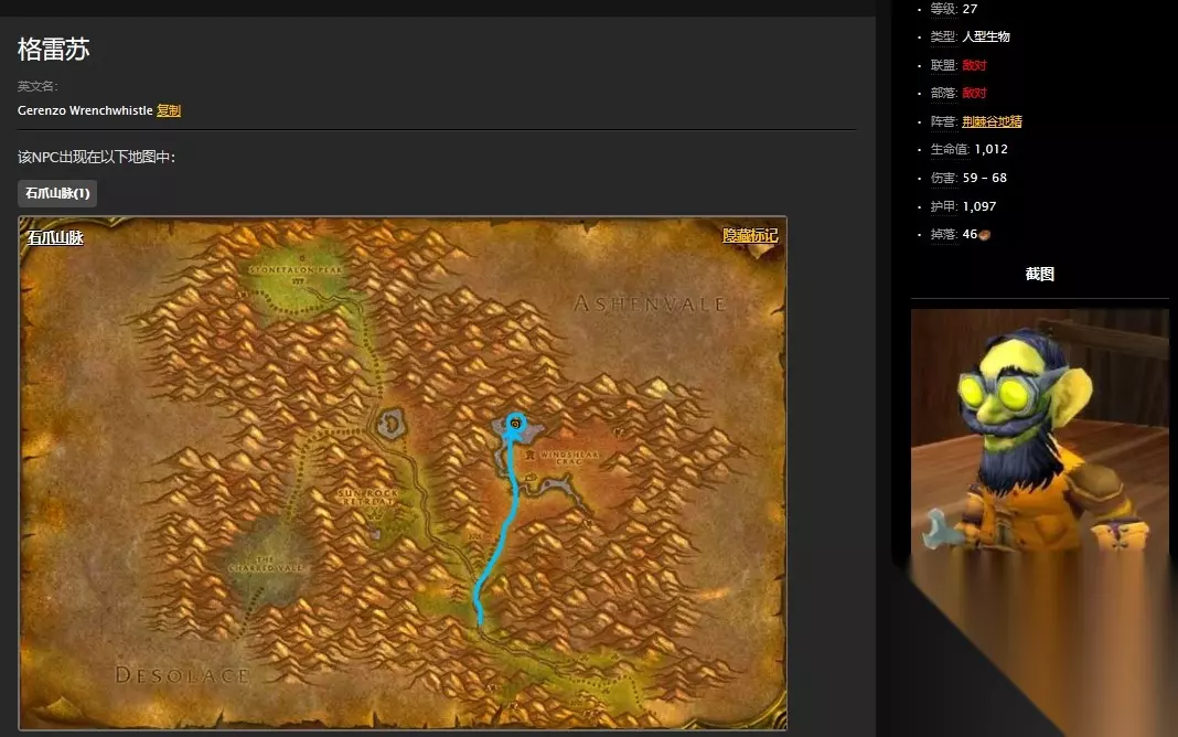 魔兽世界怀旧服石爪山脉格雷苏任务怎么做?WOW怀旧服格雷苏在哪儿?玩家在石爪山脉做任务的时候可以在菲兹克斯处接到格雷苏任务,这是这个系列任务的最后一步,玩家需要猎杀掉麻风侏儒工程师格雷苏,有很多人找了半天找不到格雷苏在哪儿,今天86来告诉大家格雷苏任务怎么做,具体操作如下: 任务接取地址 玩家可以在石爪山脉的菲兹克斯处接取到格雷苏任务。 菲兹克斯的具体位置如下: