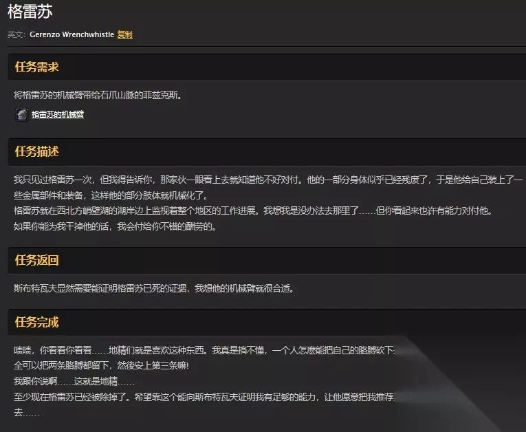 任务具体要求 菲兹克斯要求玩家去猎杀掉风险投资公司石爪山分部的首席工程师格雷苏。 他是一个麻风侏儒,使用机械替换了自己的一只手臂,成为了改造人。 他并不好对付,玩家需要小心行事。