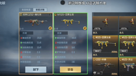 双持CZS2-魔礼寿与M12S-雷霆王者对比,可以发现双持CZS2-魔礼寿射速方面占优势,不过在伤害和弹道方面的数据略逊一筹。