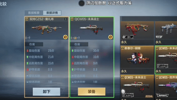 双持CZS2-魔礼寿与QCW05-未来战士对比可以发现,射速和弹道方面的数据完全占优势,也就是说在实战中,双持CZS2-魔礼寿的小连发弹道会比QCW05-未来战士更加稳定,射速的优势也会使其秒度更高。