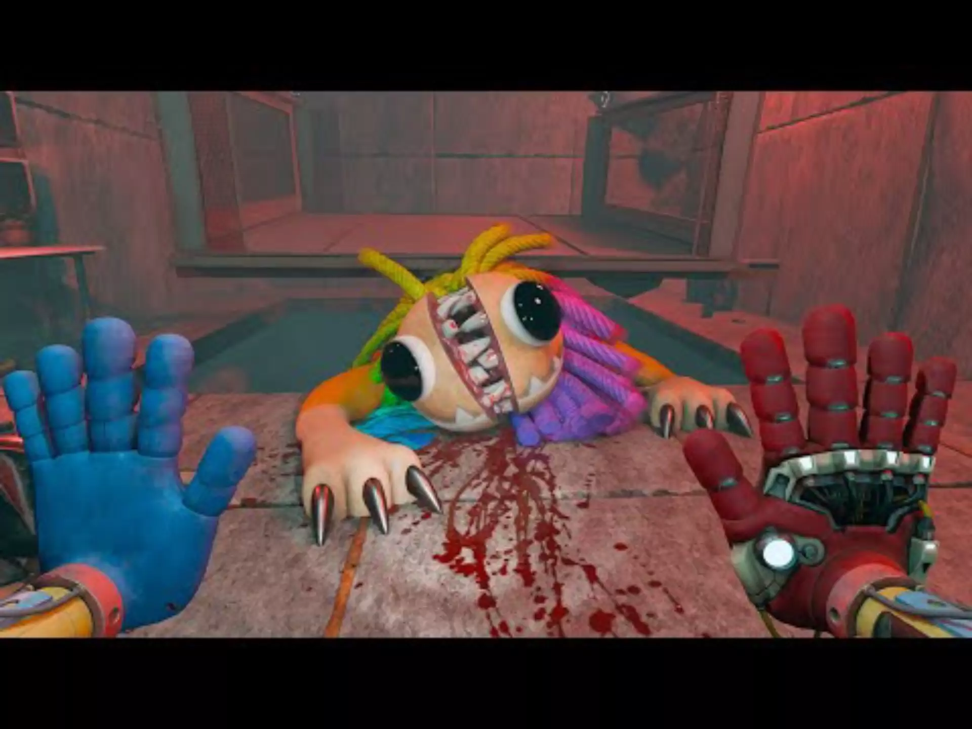 这是《波比的游戏时间》第四章的动画短片,展示了其中所有的Boss对抗内容,画面呈现了游戏里的特色道具抓取手套,以及昏暗的游戏场景,能让观众直观了解该章节的Boss对战环节。