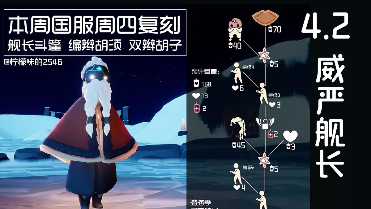 这是光遇4.2潜海季退休海军将领的复刻资讯,展示了该先祖的脏辫背头发型、厚重感斗篷等兑换物品,还有劝阻动作1-4级展示,兑换合计需168白蜡烛、21红蜡烛、13爱心,为玩家提供兑换参考。
