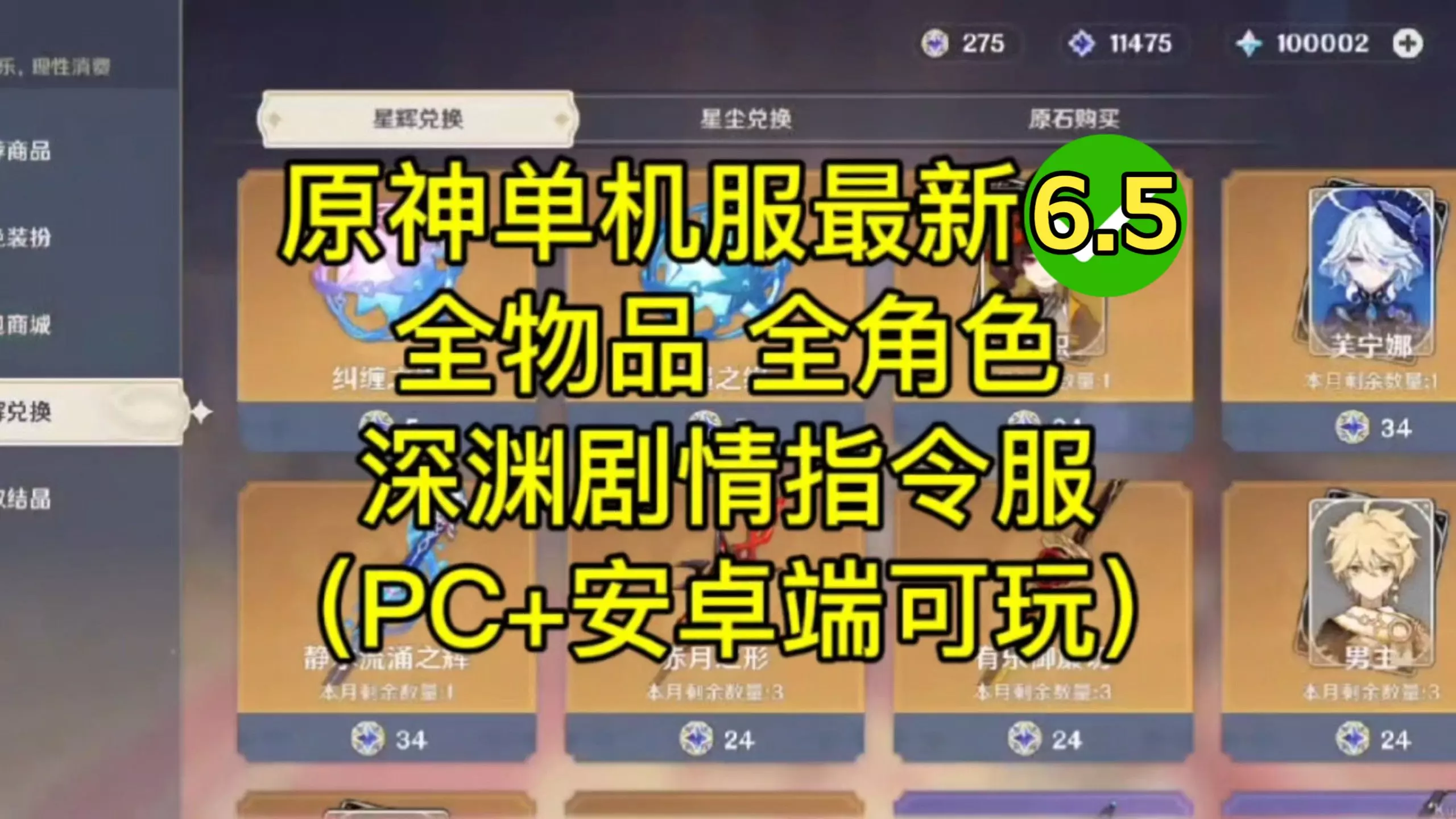 这是一款6.5剧情的原神私服,为最新稳定公益版,3.6补档后已测试可用,支持添加mod,还能使用指令,可体验包括自定义角色在内的相关游戏内容。