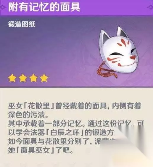 原神神樱大祓狐狸面具作用介绍 面具用了解锁武器图纸,白辰之环,没什么用,这个东西就是有点纪念意义和价值。很多人最初以为是装饰品,用了戴角色头上的。全部任务完成会有“附有记忆的面具”。是锻造图纸,使用后会被摧毁。白辰之环是加充能的法器,是用是留,请大家酌情选择。