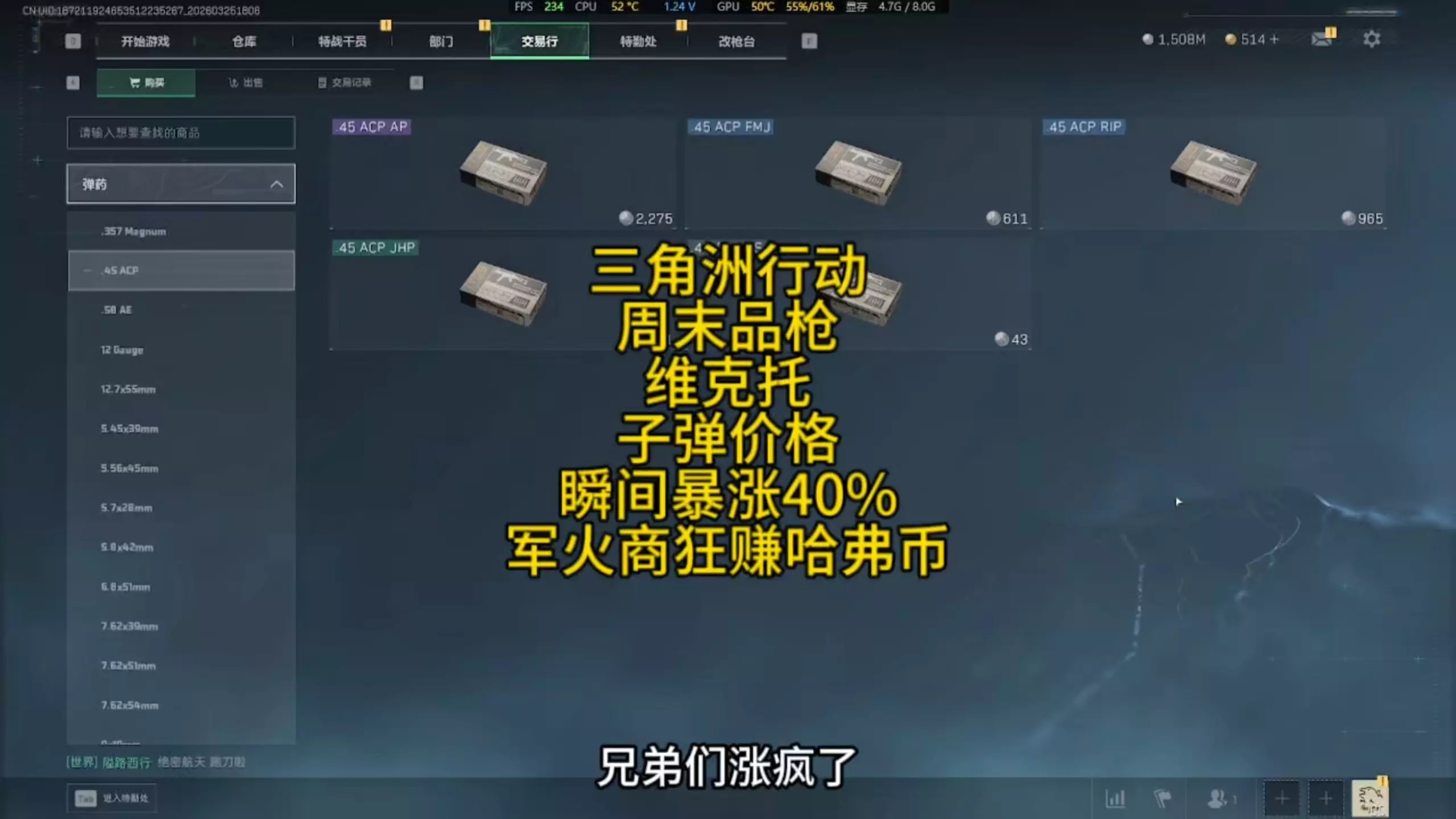 《三角洲行动》周末开启维克托冲锋枪品枪活动,适配的.45 ACP AP子弹价格暴涨40%,从1900涨到2275,文中还给出了该子弹的军火商购入价位参考,同时展示了其他同口径子弹的交易价格。