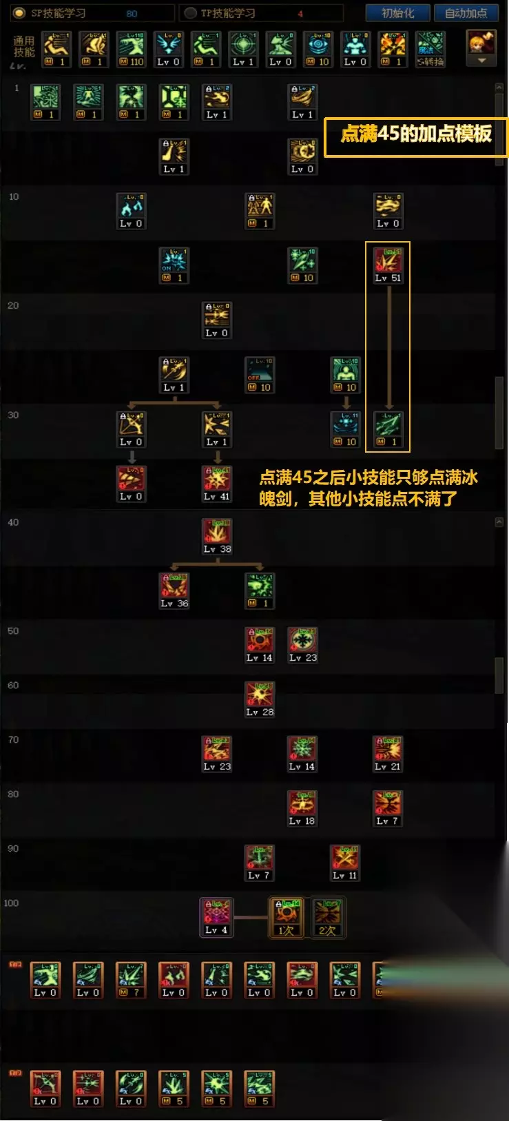 舍弃45技能则可以在冰魄剑、破冰飞刃、回旋冰枪和冰魄之弓中选择两个加满并点满tp。 2、点满45级技能