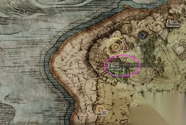 艾尔登法环封印魔女的废墟流程图文攻略 1、传送到“宁姆格福-啜泣半岛”区域的“玛莉卡第四教堂”赐福点,目标地点就是左下方的“封印魔女的废墟”。