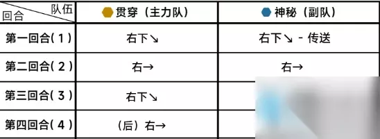 三、队伍选择:神秘主力队、贯穿主力队。 四、详细战斗: 主力队: 第一回合(1),右下。 第二回合(2),右。 第三回合(3),右下。 第四回合(4),(后)右。 副队: 第一回合(1),右下—>传送。 第二回合(2),右。 第三回合(3),左—>传送。 第四回合(4),(先)右。