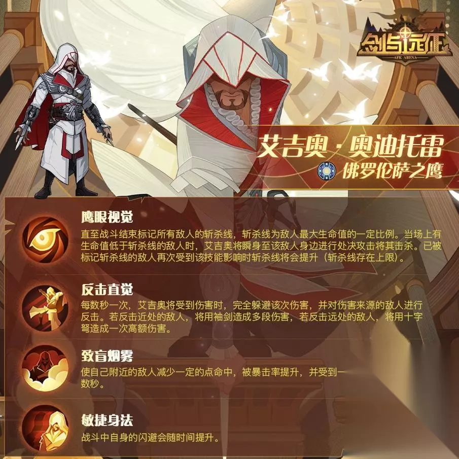 艾吉奥听说之后,也作为活动的联动角色登场,他的技能设定延续了原游戏中刺客暗杀的玩法,大招复刻了鹰眼视觉,可以标记敌人的斩杀线,时机成熟就可以一击必杀。二技能反击直觉类似原游戏里的袖剑反击,实战效果出众。四技能还可以提升闪避,可以说是个非常强大的刺客。