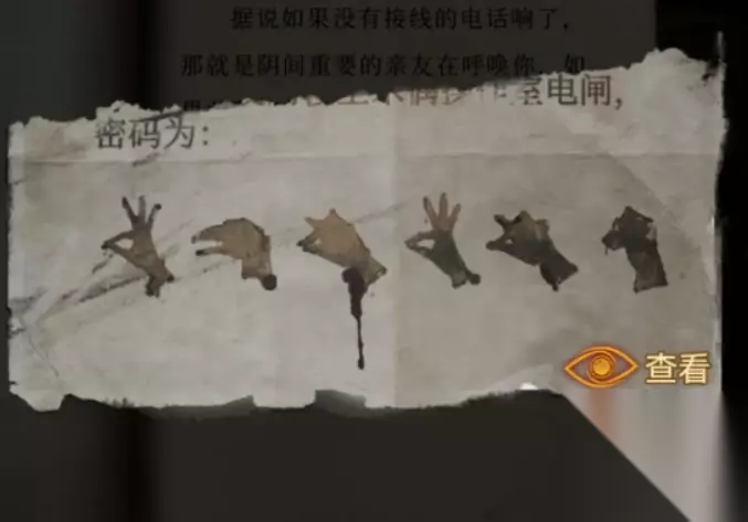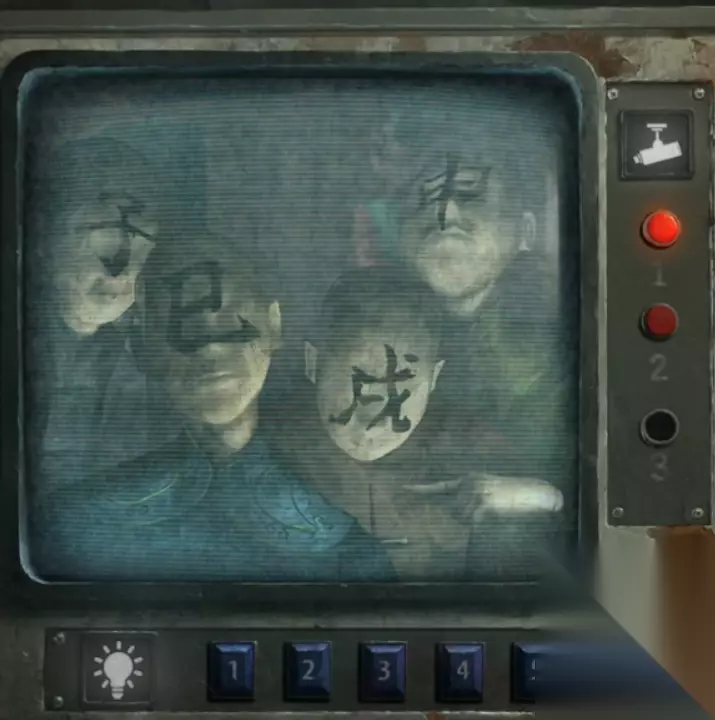 拿到线轴后男主那边打开了电闸,回到最左边的监控查看会发现监控下面的灯光按键可以使用了,这里我们需要把密码线索传递过去,也就是我们刚刚看到的密码红1蓝2白3红5,这里手动点一下红色1下、蓝色2下、白色3下、红色5下后继续剧情,剧情后右边的监控也打开了查看一下是四个人偶,右边还有一只手指向左侧,所以按照从右向左的顺序记一下申戌巳子。