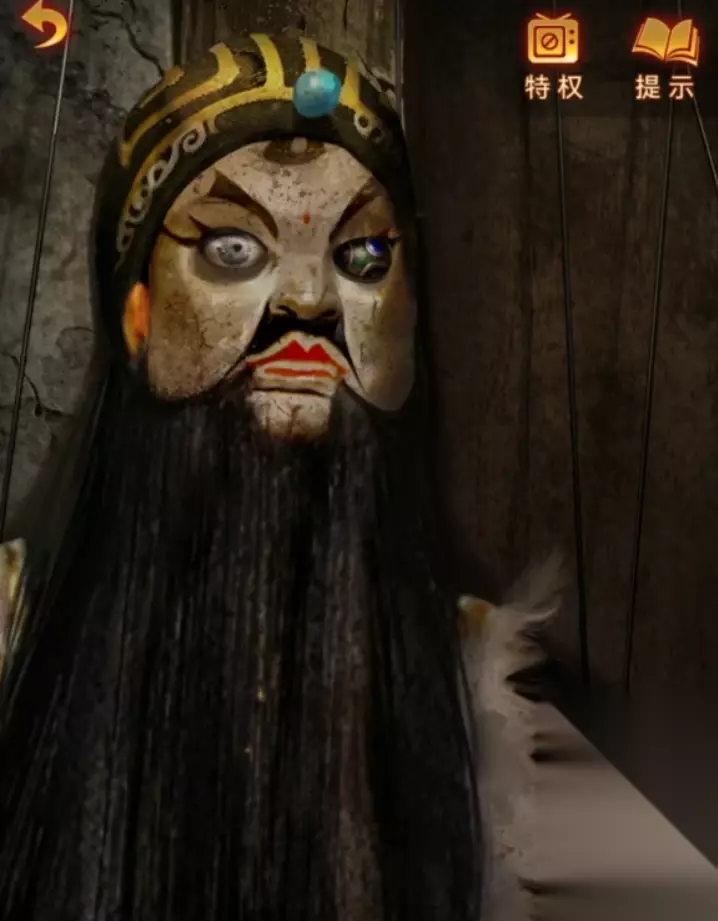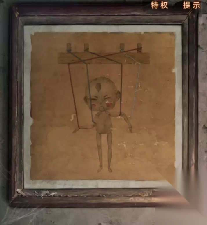 记下来后后退一下来到缝纫机房间,房间右下角有个很小的木偶戏,插入摇把后就能开始木偶亮相小游戏了,这里的线索就是我们在门旁边的小木偶画,上面四个按键分别控制的是第一条线左大臂,第二条线右大臂,第三条线右小臂,第四条线左小臂,记住后就可以开始小游戏了,三次在规定时间内调整到右下角的动作就能获得没脸面具了。