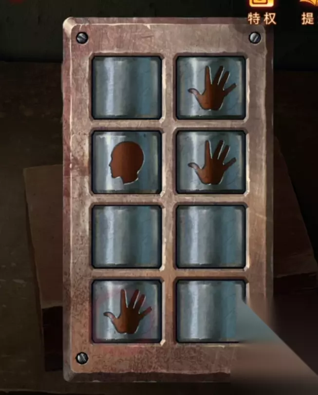 回到左边房间,把拳头雕像放在剪刀雕像旁边就能拿到马鞭,进入监控室提示去找一下他们位置,调查第二个监控的1号能找到男主,调查第二个监控的2号就能开始调整了,下面的六个手势会随机调整,我们需要在对应手势正确的时候按下面六个按键,让手势在正确的时候亮起灯光,这里调整错了也没有关系可以改正,全部调整完毕后就能继续解谜了。